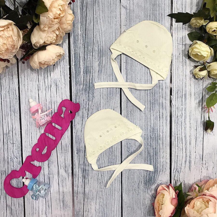 Чепчики из интерлока-пенье. Украшены кружевом.